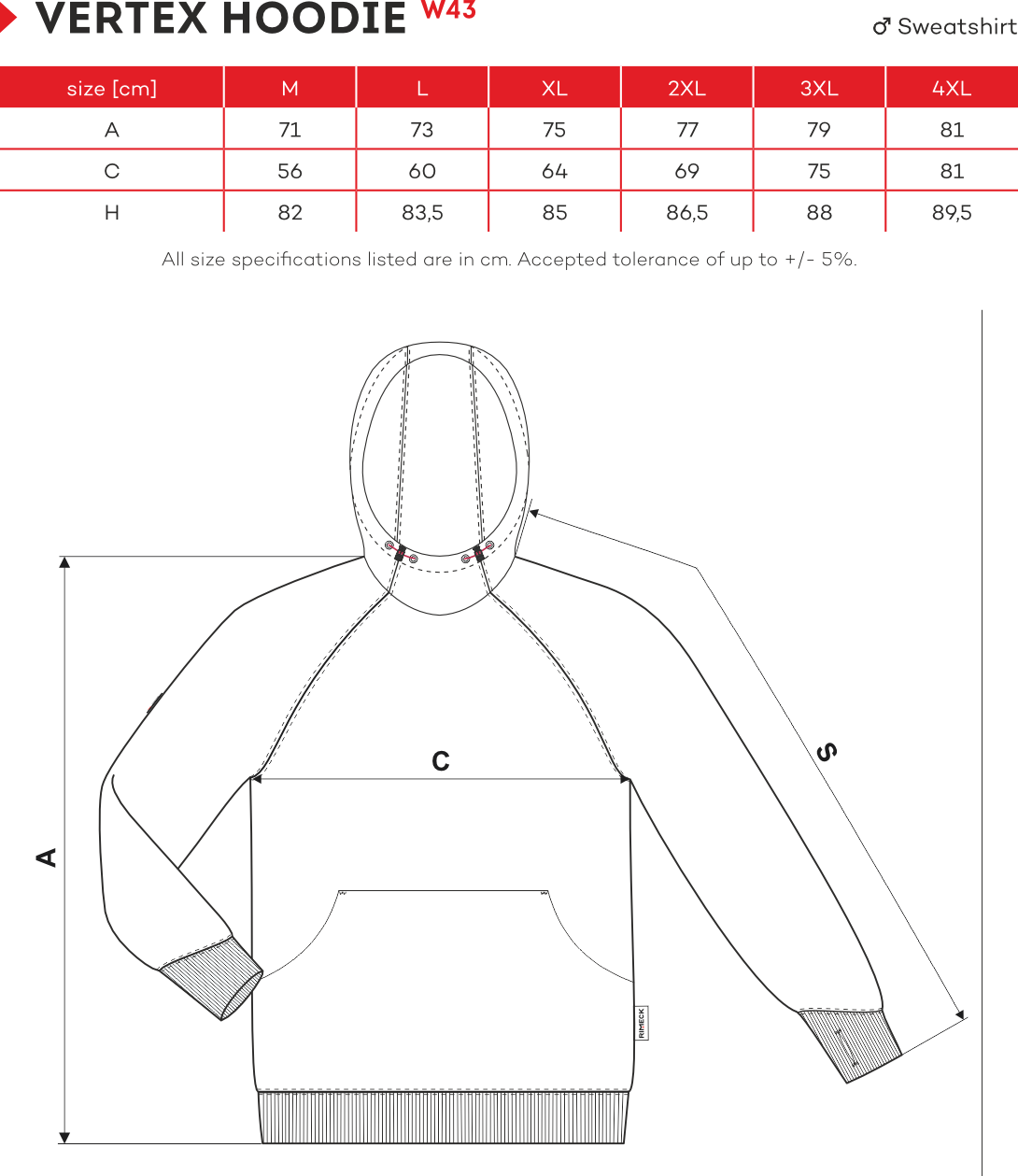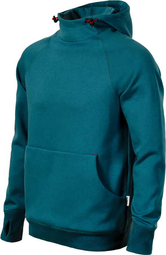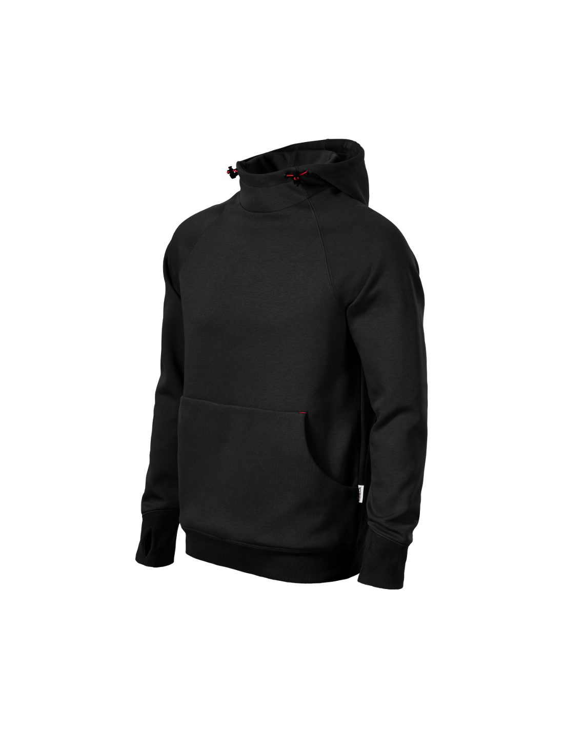 Prosty krój ze szwami bocznymi. Kaptur z podszewką, regulowany elastycznym sznurkiem. Lamówka na karku wzmocniona kontrastową taśmą. Raglanowe rękawy z podwójnym przeszyciem. Kieszeń typu kangurka. 2 ukryte kieszenie na suwak. Dolny ściągacz, mankiety i lamówka z dzianiny ściągaczowej 2:2 z dodatkiem 5 % elastanu. Mankiety z otworem na kciuk. Elementy kontrastowe
