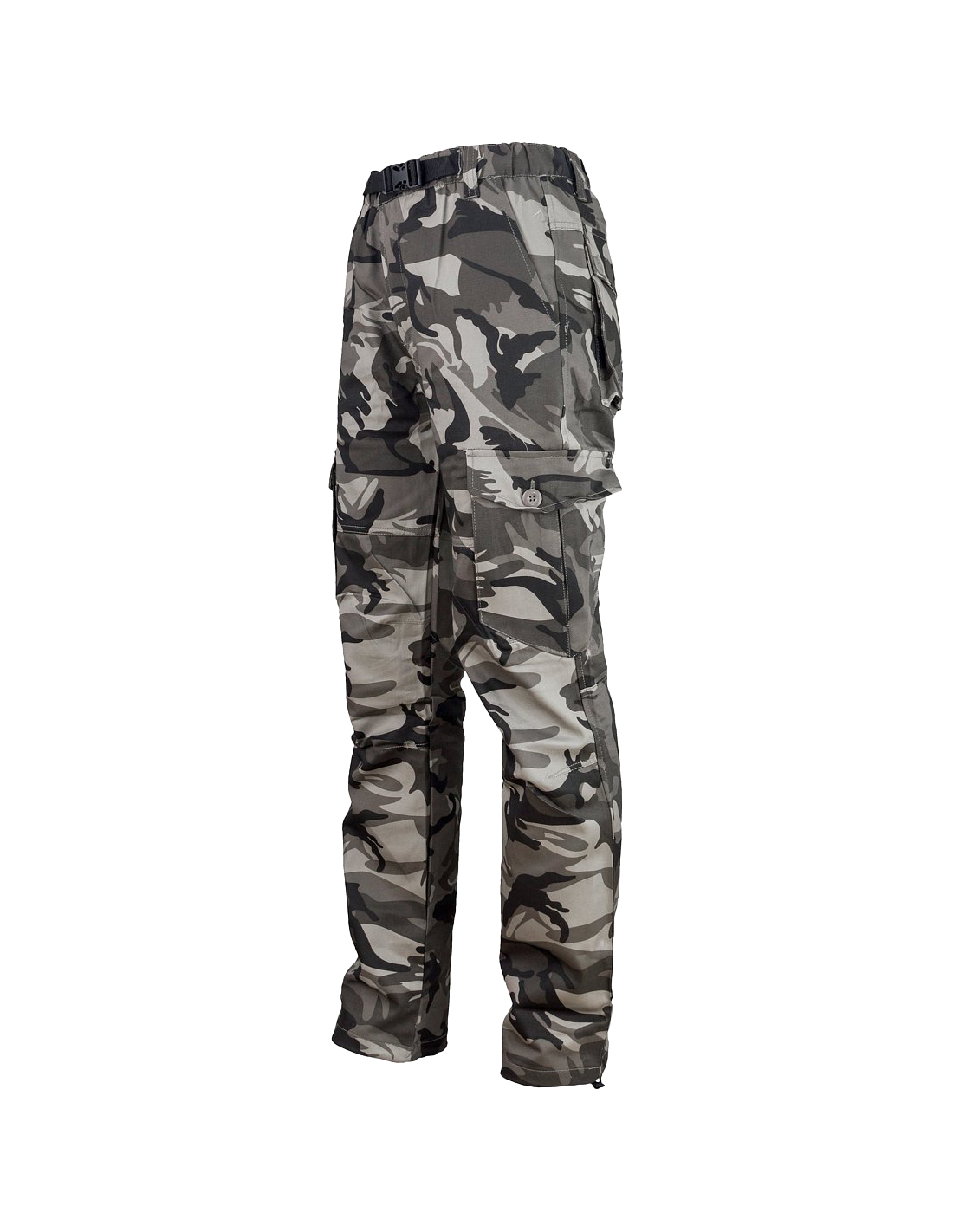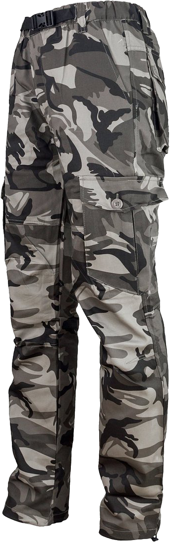 Spodnie CAMO GREY z regulacją w tali oraz gumką. Posiadają liczne kieszenie: 2 z przodu, 2 z tyłu oraz 2 po bokach nogawek zapinane na guziki. Nogawki wyposażone w ściągacze do regulacji.